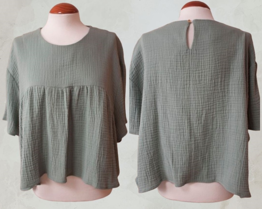 Blusa corta oversize de manga corta con hombro caído y frunce en corte delantero. NOTA: con puntilla sólo bajo pedido.
